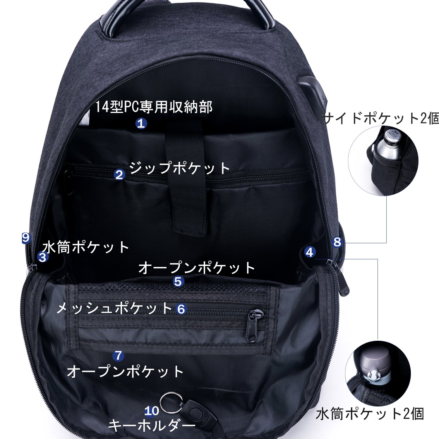 Inside: 14 type PC exclusive storage part × 1, zip pocket × 1, mesh pocket × 1, water bottle pocket × 2, open pocket × 2, key holder × 1