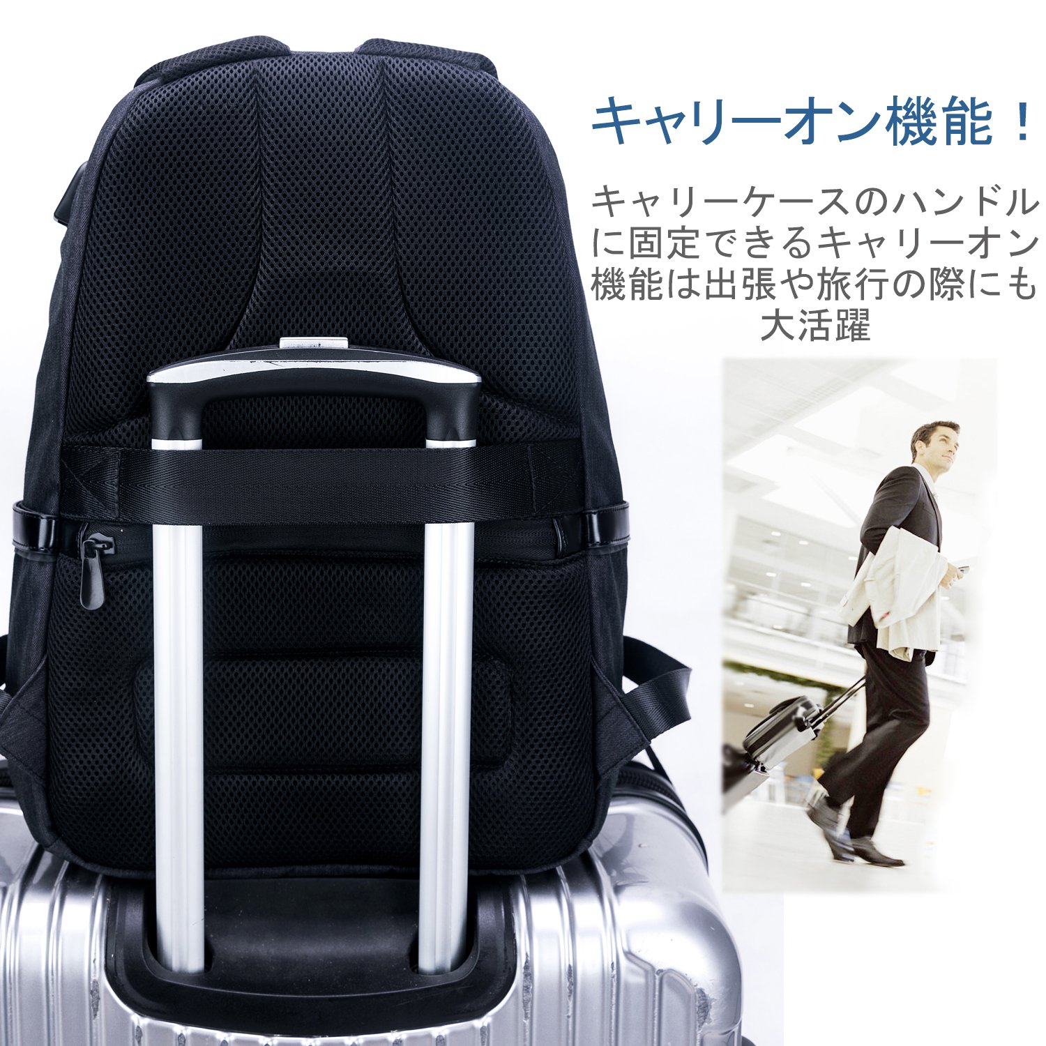 Carry-on function that can be fixed to the handle of the carry case is also very useful during business trips and traveling!