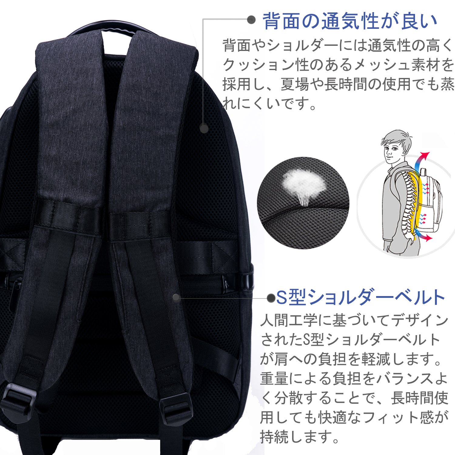 S type shoulder belt designed based on ergonomics reduces the burden on the shoulder.