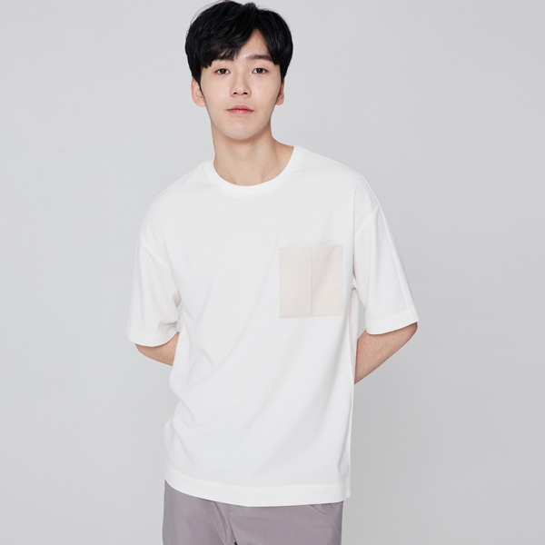 | 배색 컬러의 포켓 디자인으로 포인트를 준 남성 반팔 티셔츠입니다. 내추럴한 멋을 보여주는 오버핏 실루엣으로 캐주얼한 감성을 연출하였습니다. 라운드넥으로 깔끔한 외관을 보여주며 편안한 착장감을 느끼실 수 있습니다. 다양한 하의와 코디 연출이 용이한 아이템입니다.
