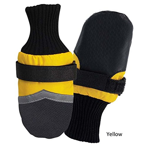Product Description Protect your dog's feet from the elements. Guardian Gear Dogs Boots provide durable, long-lasting protection during any outdoor activity. Boots keep paws safe and dry and help prevent injuries from heat, cold, ice, salt, stones and abrasive surfaces. Made of breathable, water-repellent fabric with tough vinyl soles and toes. Stretchy, ribbed knit cuffs add comfort, and adjustable Velcro straps keep boots snug and secure. Decorative reflective strip increases visibility. Colors available: Blue with Black trim; Pink with black trim; Yellow with black trim. Available sizes: XXX-Small fits up to 1 1/2 in; XX-Small fits 2 1/4 in; X-Small fits 2 3/4 in; Small fits 3 1/4 in; Medium fits 3 3/4 in; Large fits 4 1/4 in; X-Large fits 4 3/4 in; XX-Large fits 5 1/2 in.