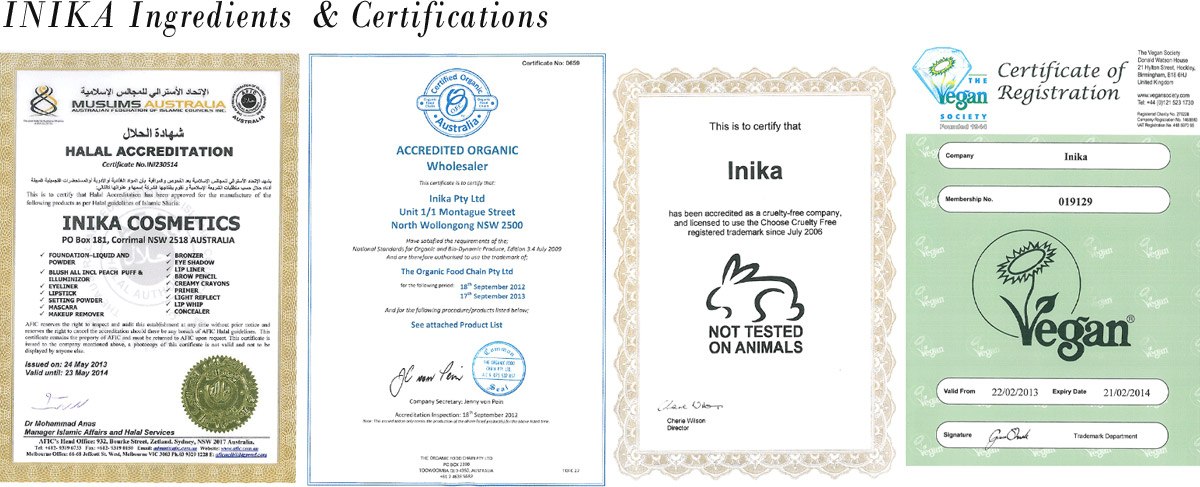모든 이니카 화장품과 케어 제품은 유럽연합의 화장품류 관련 법안 지침규정(76/768/EEC)에 의한 표준절차에 맞게 제조되며 발암 물질, 유전자 조작이나 선천적인 결함이 있는 것으로 의심되는 일체의 성분을 사용하지 않습니다.