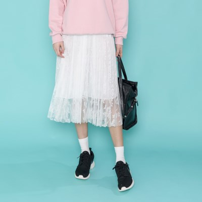 "C O M M E N T여성스러운 레이스 플리츠 스커트 소개합니다,다양한 무드를 연출해줄 아이템인데요모델처럼 맨투맨과 코디하시면 사랑스러운룩이 완성되며니트, 블라우스와 코디하시면 여성스럽게 연출하실수 있답니다.전체 허리밴딩으로 편안하게 착용되며플리츠 주름 디자인으로 체형커버에 도움이되요!다양한 상의와 여성스럽게 연출 가능한 레이스 스커트 추천드려요^^"