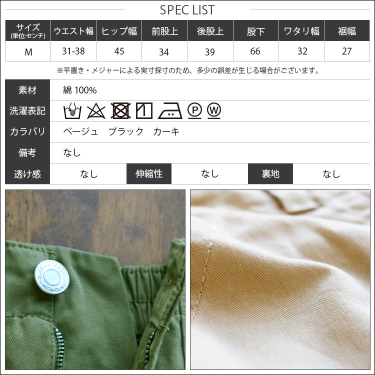 実寸:ウエスト幅 31-38cm ヒップ幅 45cm 前股上 34cm 後股上 39cm 股下 66cm ワタリ幅 32cm 裾幅 27cm