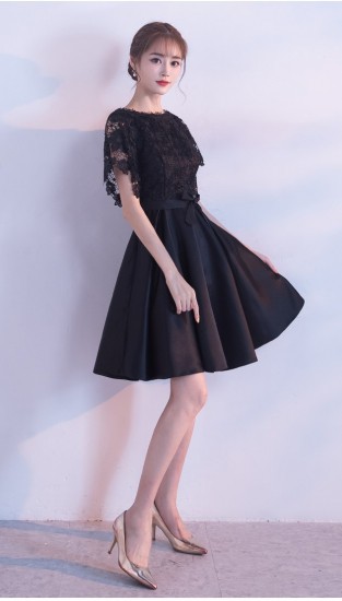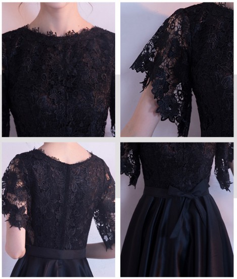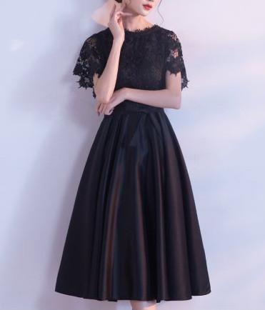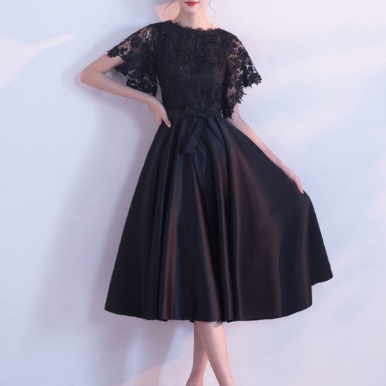 ワンピース ミモレ丈 レディース ドレス ブラック 花柄レース リボンベルト 半袖 フレア 可愛い お呼ばれ パーティー 上品 お呼ばれ drgz0751