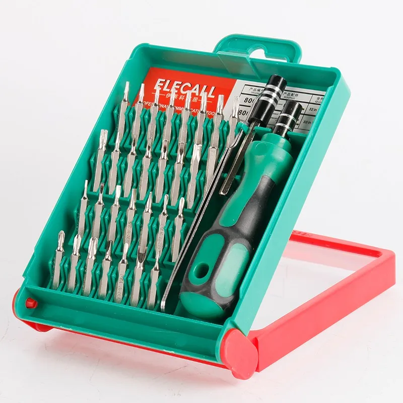 This 33-in-1 screwdriver set is made of sturdy, high-hardness materials, comes in a self-contained tool box, and is ideal for precision repairs for small electronics, small machinery, and personal devices. The bits are magnetized for maximum ease of use, and the non-slip handle makes for easy use. Great for watches, eyeglasses, cell phones, tablets and more.