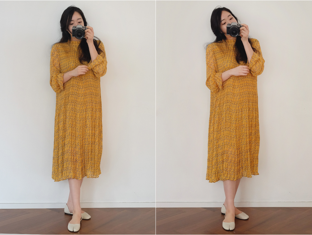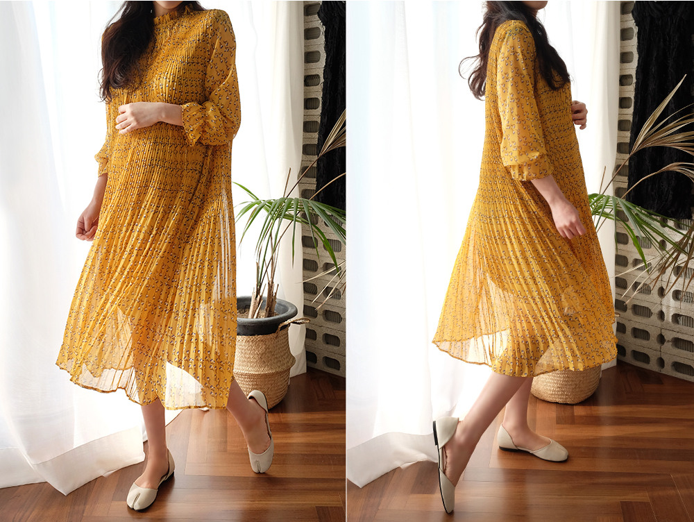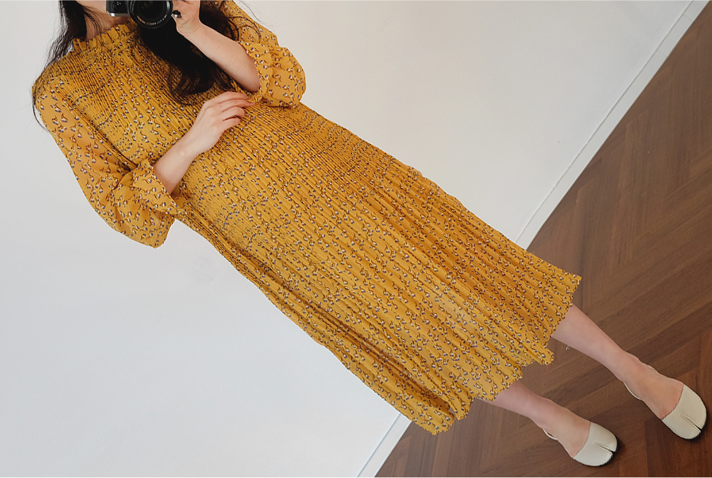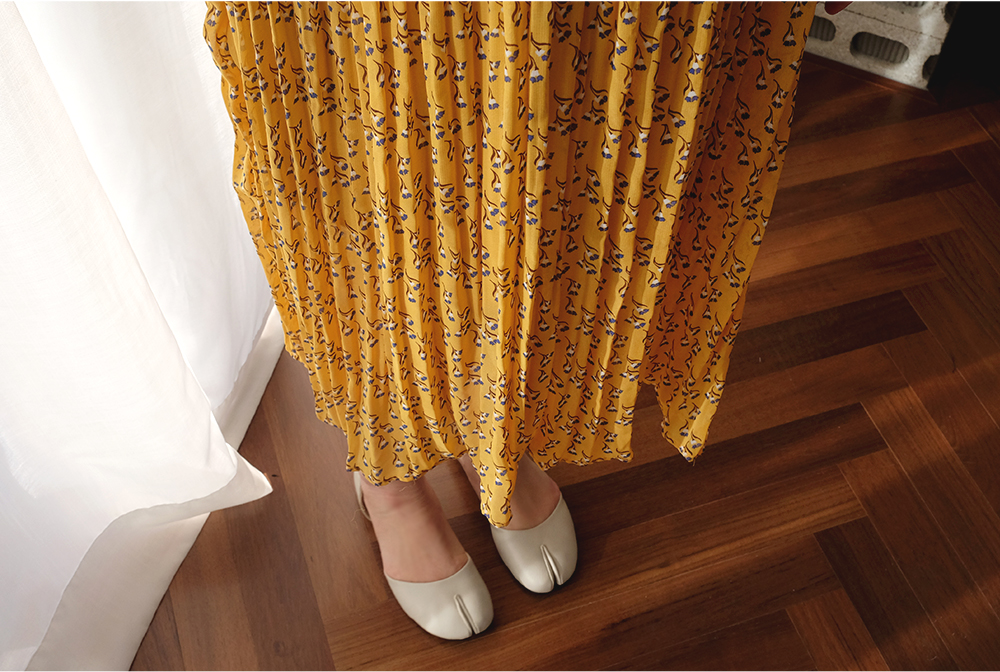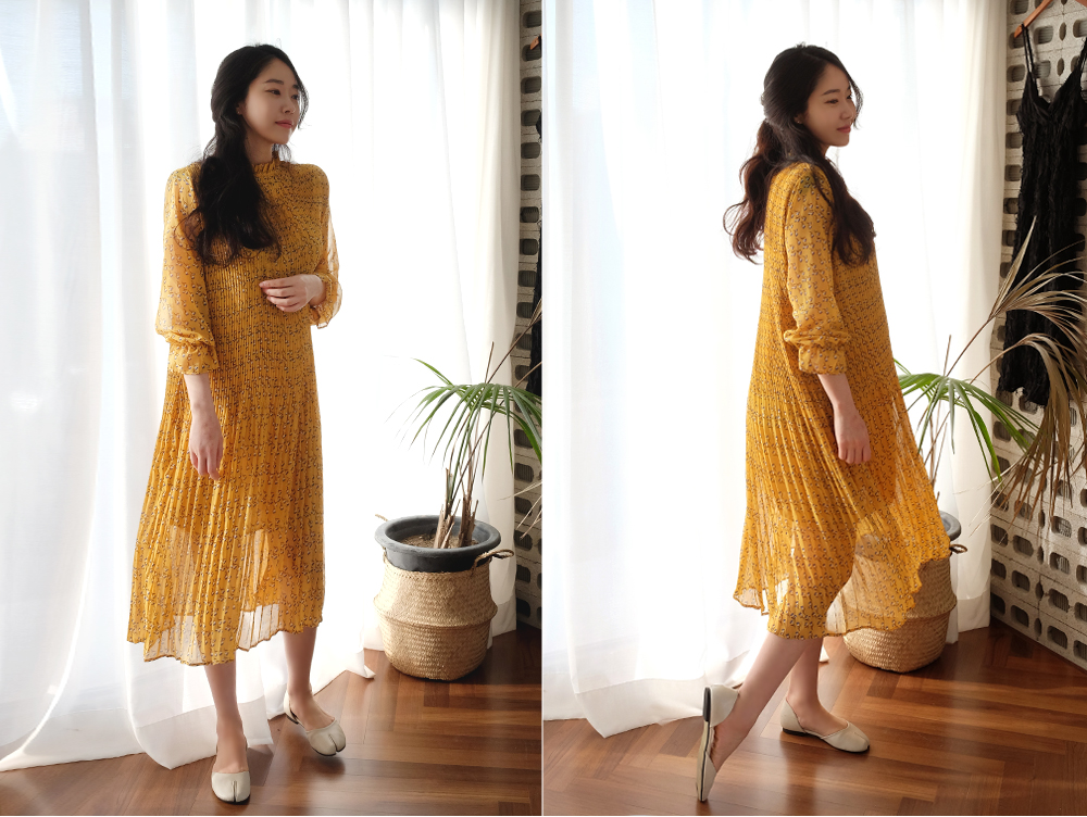 무릎 밑까지 오는 롱한 기장에 촘촘하게 잡혀있는 세로 주름디테일이