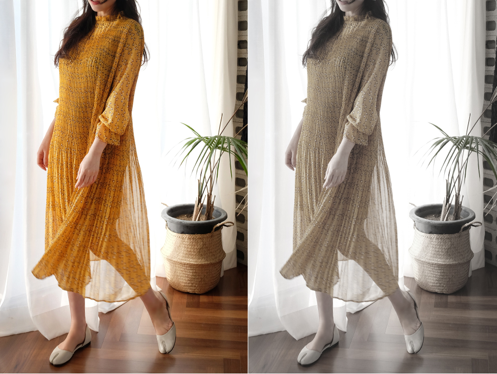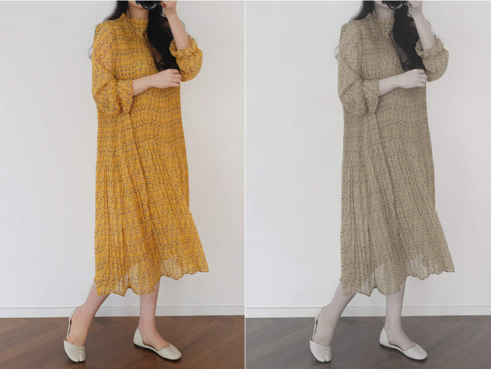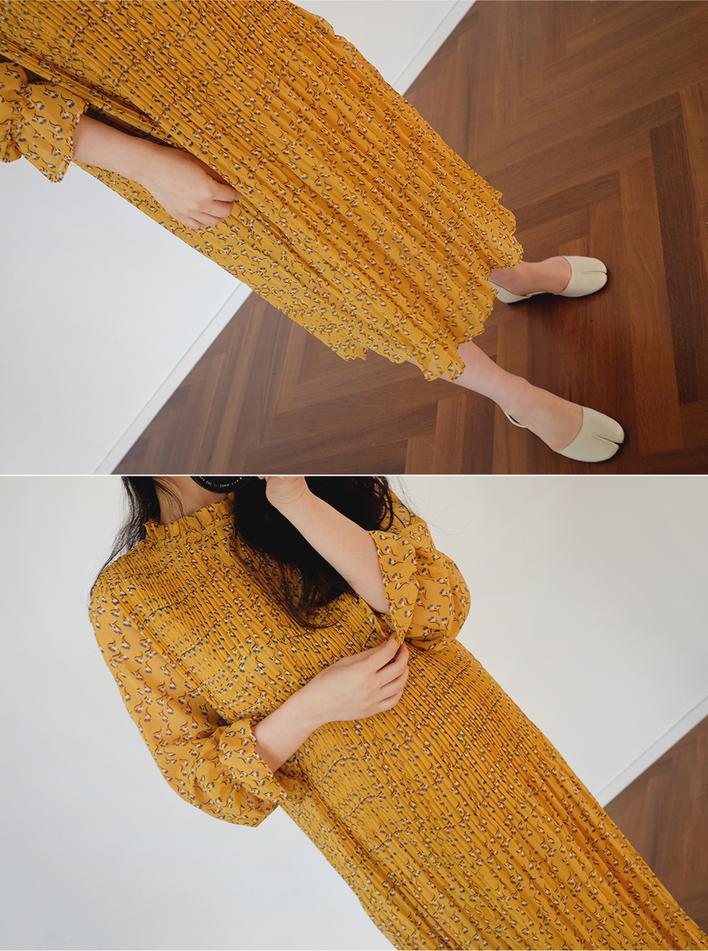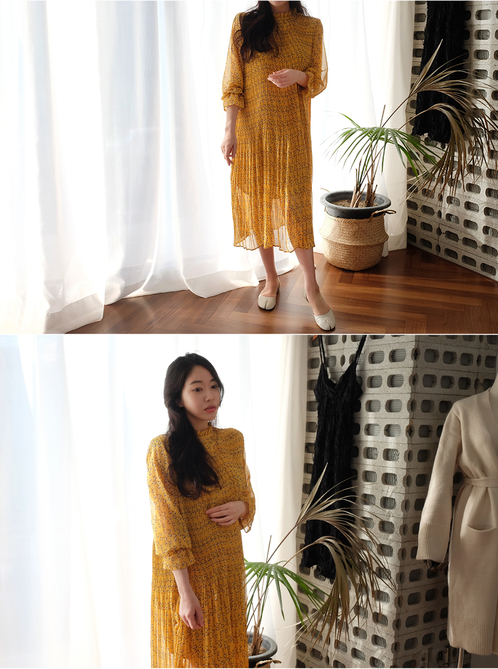 무릎 밑까지 오는 롱한 기장에 촘촘하게 잡혀있는 세로 주름디테일이