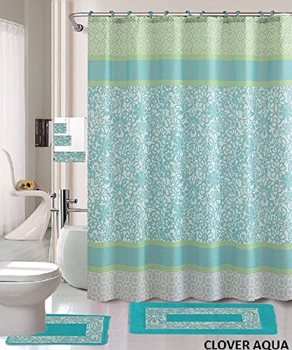 18 Piece Bath Rug Set Aqua Blue Green print bathroom rugs shower curtain/rings and Towels sets-Clover Aqua