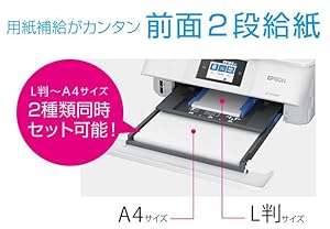 用紙給紙がカンタン。2段給紙が使いやすい。 2種類の用紙を同時にセットできます。写真用紙と普通紙を入れ替える必要がありません。 また、紙を入れたままトレイを収納でいます。 背面手差し(1枚)の給紙にも対応。 |