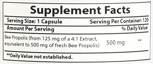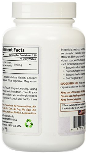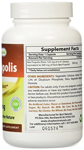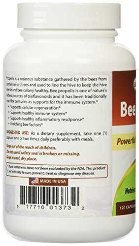 -. Binding : Health and Beauty -. Brand : Best Naturals -. EAN : 0817716013732 -. Feature : Enriching Bee Factors / Supports Cellular Regeneration / Specialty Supports / Bee Propolis 500 mg per capsule -- 120 Capsules / All Best Naturals products are manufactured in accordance with Good Manufacturing Practices (GMP), among the highest standards in the world -- Proudly Made in USA -- Purity & Potency Guaranteed -. IsAdultProduct : 0 -. Label : Best Naturals -. Manufacturer : Best Naturals -. ProductGroup : Health and Beauty -. ProductTypeName : HEALTH_PERSONAL_CARE -. Publisher : Best Naturals -. Studio : Best Naturals -. Title : Best Naturals Bee Propolis 500 mg 120 Capsules -. UPC : 817716013732