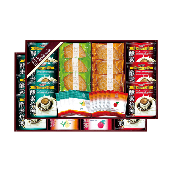 ●世界の優れたコーヒー農園から選りすぐりのコーヒー豆を独自製法酵素焙煎。コーヒーの味、香り、旨みを1杯ずつに凝縮したドリップコーヒーと、食感の良い2種類のリーフクッキー、セイロンウバとリンゴの香り豊かなフレーバーティーをティーバッグに仕上げて詰め合わせたバラエティギフトです。