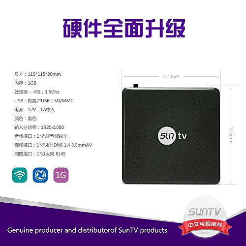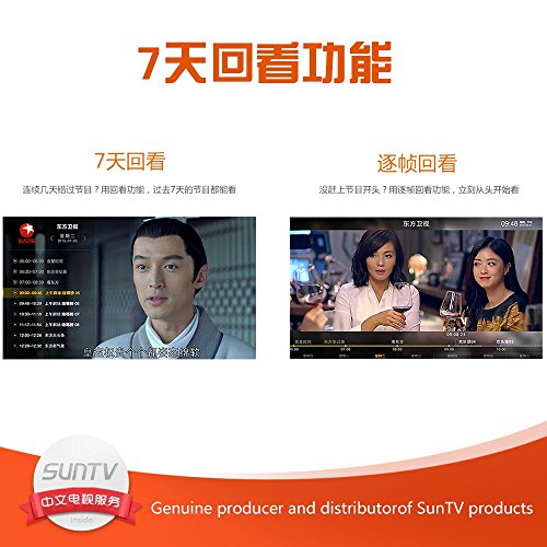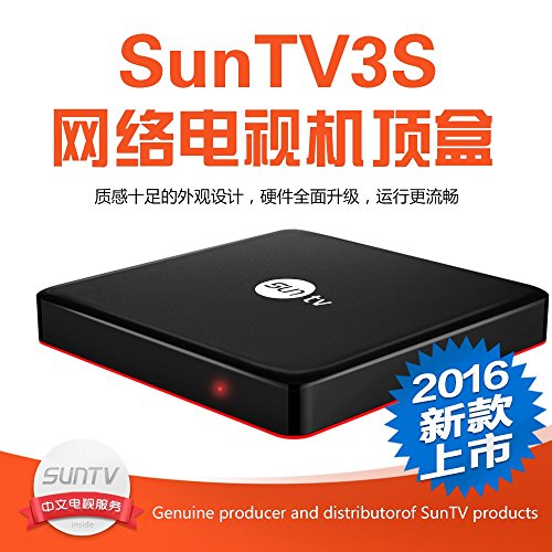 -. Feature : The New Model 2016 SunTV 3S $99 special package includes SunTV Set Top Box (with Remote Control, HDMI Cable and Wall Power Charger), and 2 year Chinese TV service subscription(CICC and TVB USA certified). / 130+ Chinese live streaming channels directly from Mainland China, including CCTV, Satellite Television, and local TV channels. / Unique time zone shift and 7-day playback feature. You can watch 7 days of recorded programming across all the TV channels at anytime you like. / Faster and smoother.Quad Core processor, stable Internet connectivity, heat dissipation and low power usage. / 30 day Refund Policy. SunTV warrants the SunTV set-top box hardware against defects in materials and workmanship under normal use for a period of service (subscription) from the date of purchase. Automatically software updated, free-of-charge.