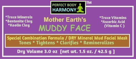 -. Binding : Misc. -. Brand : Perfect Body Harmony -. Color : Off White -. EAN : 0616913793795 -. Feature : Special Combination Formula / DRY Mineral Mud Facial Mask * Bentonite & Kaolin Clay. / Contains Both Bentonite & Kaolin Clay & Is Off White in Color. This is a thinner feeling clay than our straight Ultra Pure Clay Harmony Sodium Bentonite Clay. / Formulated with Trace Vitamins & Minerals As Well As Ascorbic Acid (Vitamin C). / Tones * Tightens * Clarifies * Re-Mineralizes! ~ Perfect To use alone or as a base when making homemade facial masks recipes like Avocado, Yogurt, and/or Honey Masks! / 30 DAY CUSTOMER SATISFACTION GUARANTEE! -. Label : Perfect Body Harmony -. Manufacturer : Perfect Body Harmony -. MPN : B00PCVAI5E -. PackageQuantity : 1 -. PartNumber : B00PCVAI5E -. ProductGroup : Beauty -. ProductTypeName : BEAUTY -. Publisher : Perfect Body Harmony -. Studio : Perfect Body Harmony -. Title : "MUDDY FACE" (Mother Earth's Blend) Mineral MUD Mask DRY Clay White POWDER MIX * Special Combination Formula With Trace Vitamins & Minerals, Vitamin C, Bentonite & Kaolin Clay * 3.0 oz (by vol.) Jar. -. UPC : 616913793795
