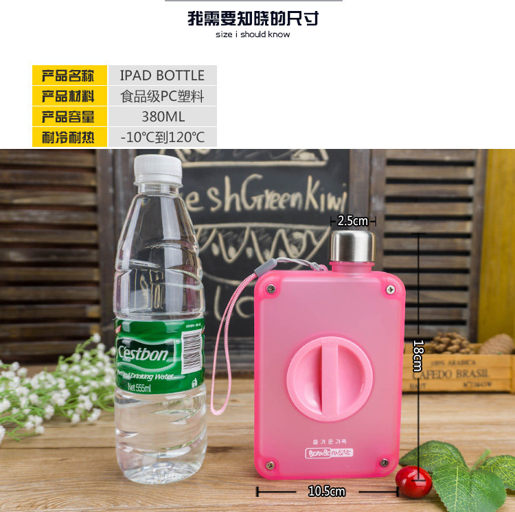杯子容量: 380ml,杯身高度:18cm,宽度10.5cm,厚度3.5cm;杯口直径2.5cm。耐冷耐热-10℃到120℃。