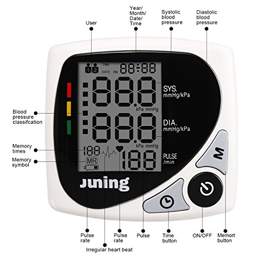 -. Binding : Health and Beauty -. Brand : JUNING -. Color : Black -. EAN : 0707409677344 -. Feature : 1.EASY TO OPERATE----New technology automatically inflates to the approP.R.Iate level, auto power off. Large buttons for easy operation. / 2.MULTIPLE FUNCTION---Not only can measure blood pressure but also heart rate / 3.EASY TO READ---It has a lager LCD screen,though the old people can see the measuring results clearly.When you are using it,the wristband will inflates automatically,which is an intelligent electronic device. / 4.NOT EASILY DAMAGE----Acrylic material is not easy to wear and damage / 5.PROFESSIONAL AFTER SALES SUPPORT---needn't worry can not use or have any problem with it. we wil always here to help you solve the problem. -. IsAdultProduct : 0 -. Label : JUNING -. Manufacturer : JUNING -. MPN : OLFY-XY-01 -. PackageQuantity : 1 -. PartNumber : OLFY-XY-01 -. ProductGroup : Health and Beauty -. ProductTypeName : HEALTH_PERSONAL_CARE -. Publisher : JUNING -. Size : Black -. Studio : JUNING -. Title : Digital Blood Pressure Monitor Heart rate calculation Professional Accurancy Easy to Operate & Store -. UPC : 707409677344