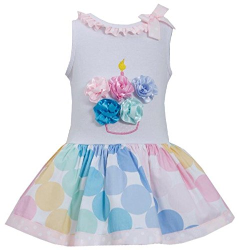 -. Binding : Apparel -. Brand : Bonnie Jean -. Color : Multi-color -. Department : baby-girls -. Feature : Sleeveless Dress with full skirt will make her the belle of the ball / Pastel & white colors that matches all party themes / Satin ribbon flowers add dimensional sweetness! / Cotton and polyester blend fabrics / Machine wash; tumble dry low heat, iron with low heat -. Model : 4213 -. ProductGroup : Apparel -. ProductTypeName : PANTS -. Title : Bonnie Jean Birthday Cupcake Shorts Set