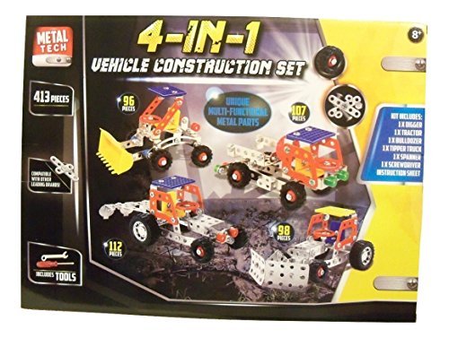 -. Feature : This is for a build your own vehicle set using real metal pieces! / Style: Construction Vehicles (Digger, Tractor, Bulldozer, Tipper Truck) / Includes everything you need to make the 4 vehicles plus 1 spanner, 1 screwdriver and 1 instruction sheet (413 pieces total) / Compatible with other leading brands, these vehicles feature real metal pieces and off road wheels! / Perfect for anyone that enjoys constructing 3D objects, especially toy vehicles!