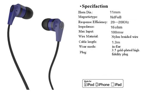 -. Feature : 1. Designed, engineered and manufactured by Skullcandy. / 2. sound delivers attacking bass, natural vocals and precision highs. / 3. Mic1-db collection-lets you manage your device. / 4. Ergomomic design, comfortable to wear and not to fall. / 5. Flattened cable for style and durability.