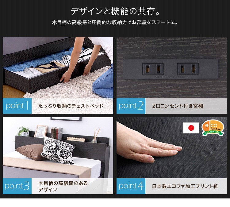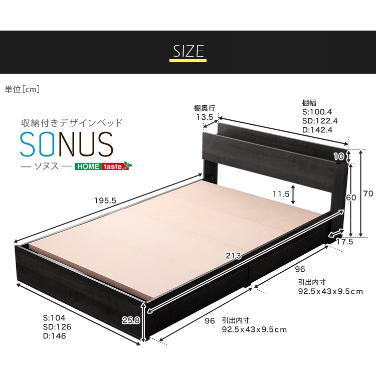 【商品について】収納付きデザインベッド【ソヌス-SONUS-(シングル)】■サイズ:外寸:(約)幅104x奥213x高70cm※商品重量:(約)51.5kg■カラー:ウォールナット オーク■素材:パーチクルボード、MDF、表面材:プリント紙化粧合板■その他:・お客様組立商品です・梱包サイズ:(1-3)(約)135.5x45.2x12.1cm(2-3)(約)114x47.6x96cm(3-3)(約)104x51x10cm・梱包重量:(ベッド本体)(約)55.26kg