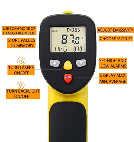 - 1.Suposun Dual Laser Infrared Thermometer have two Laser Pointer ,Non-Contact Accurate Digital Surface IR Temperature Gun,Dual Laser for more accuracy targeting and measuring temperature,Fast 0.15 seconds to response with maximum temperature display,Non-contact to targets.
