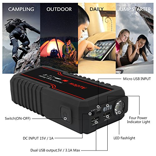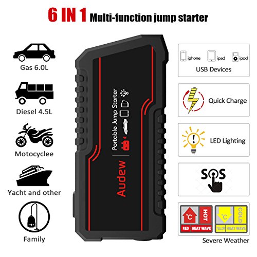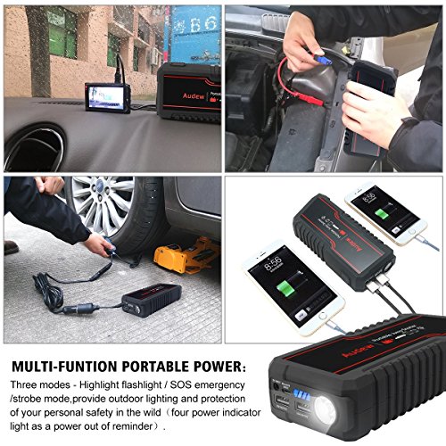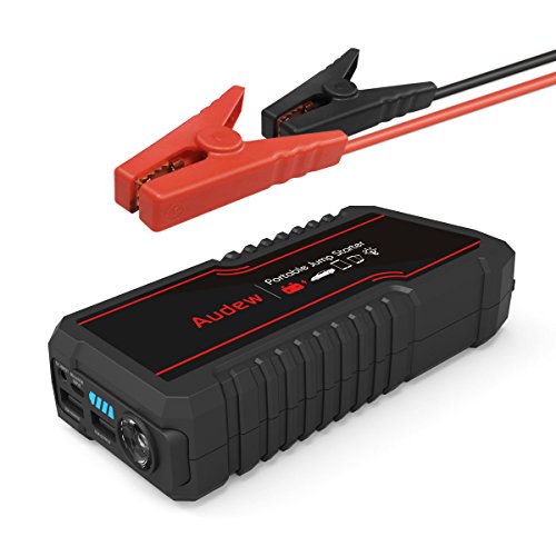 - ✔ POWERFUL & COMPACT : AUDEW car jump starter makes sure you and your loved ones can get home when stranded. Powerful enough to Jump start any size of vehicles (up to 6L gas or 4.5L diesel engine) up to 20 times with 650 amps of peak current and heavy duty clamps and cables. Compact enough to store in your glovebox.