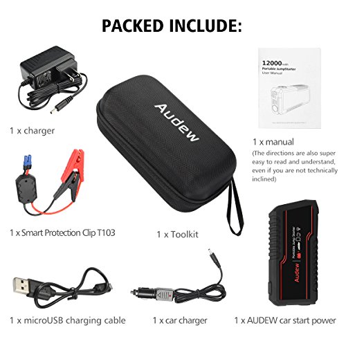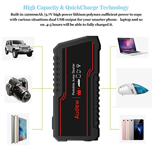 - ✔ QUICK CHARGE & HIGH CAPACITY : AUDEW car jump starter featured with 12000mAh capacity and quick charge 3.0 technology, charge compatible devices up to 4 times faster than conventional charging. Battery booster with 2 smart USB port,2 DC port, can fully charge your laptops, smartphones, tablets, and other devices.