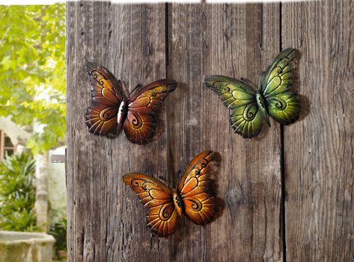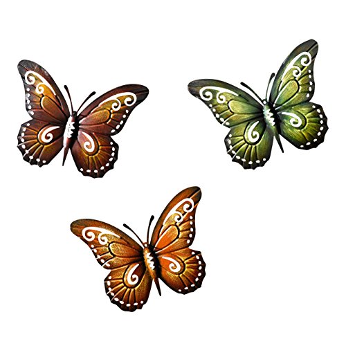 Use: Indoor and outdoor use. Perfect as home accent; Material: Punched metal filigree; Includes: Set of three butterflies with hooks for wall display; Other: Hanging hardware not included.
