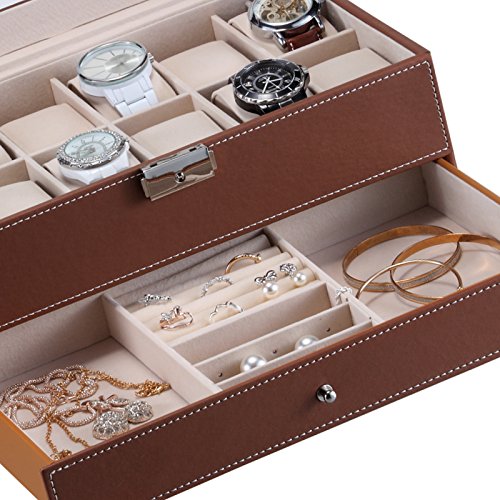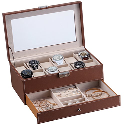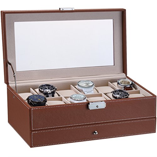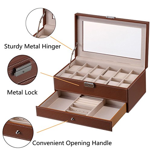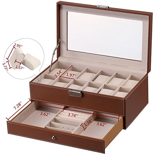 -. Title : Homde 12 Slots Watch Box PU Leather Watch Organizer with Lockable Glass Top Drawer Jewelry Tray