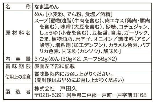 | 原材料 | 名称:なま温めん ●めん 小麦粉、でん粉、食塩/酒精 ●スープ 動物油脂(牛肉を含む)、肉エキス(鶏肉、豚肉を含む)、味噌(大豆を含む)、砂糖、コチュジャン、しょうゆ(小麦を含む)、豆板醤、食塩、ガーリック、ごま、植物油脂、唐辛子、オニオン/調味料(アミノ酸等)、増粘剤(加工デンプン)、カラメル色素、パプリカ色素、甘味料(カンゾウ)、酸味料 |