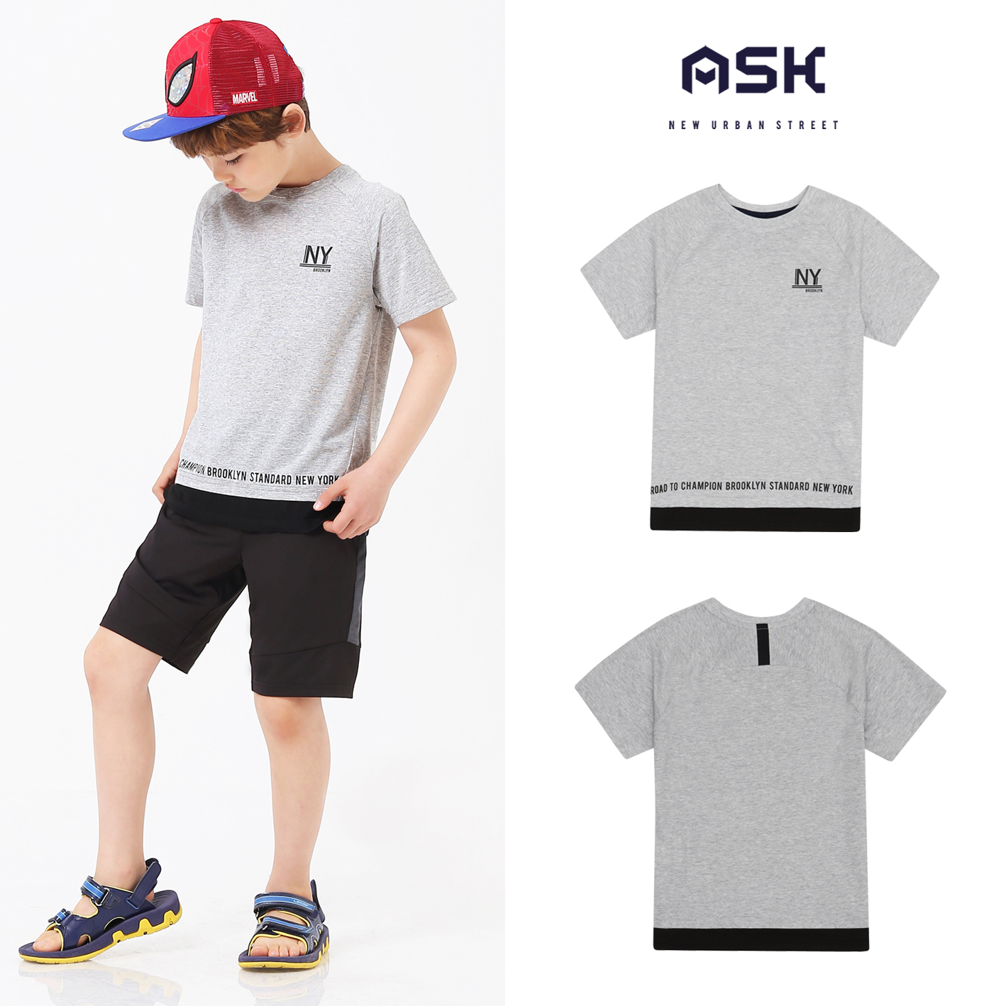 30수 MVS 소재의 티셔츠. 와끼 절개와 뒷판 절개로 디자인에 차별화를 준 스타일. 밑단 레이어드 배색과 나염으로 포인트를 준 스타일.