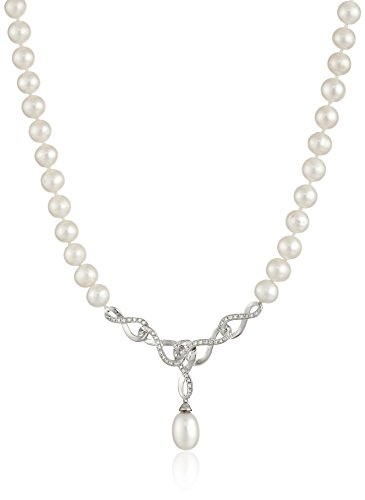 Single strand of cultured freshwater pearls featuring central oval drop affixed to intertwining infinity symbols in sterling silver set with white topazes