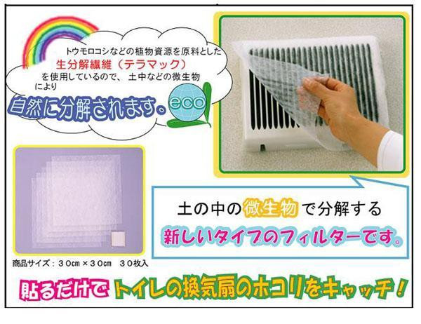 | 貼るだけでトイレ、浴室、洗面所などの換気扇のホコリをキャッチして、お掃除がラクになります♪とうもろこしなどの植物資源を原料とした生分解繊維(テラマック)を使用しているので、土中などの微生物により自然に分解されます。 |