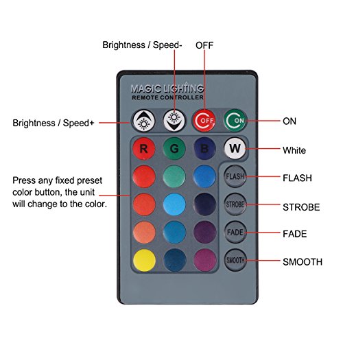 * IR Remote Control: Come with 24 key IR remote controller, 16 static effects (Red, Green, Blue, Orange, Yellow, Cyan, Purple, White, etc.) and 4 dynamic effects (Flash, Fade, Strobe, Smooth), ON/OFF, static effect brightness setting (4 grade brightness) and strobe mode speed control (5 grade speed).