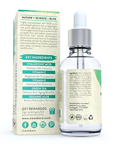 Namskara's Pure Hyaluronic Serum contains the highest concentration of all-natural Hyaluronic Acid to provide instant hydration, radiance and anti-aging benefits for smooth, soft and supple skin. Drop by drop, this advanced formula reduces wrinkles and fine lines, fades dark spots and blemishes, and dramatically plumps the skin. Endorsed by leading dermatologists, all-natural and vegan hyaluronic acid delivers instant moisture for the skin, stimulates collagen, and transforms the skin to promote a healthy and balanced glow.