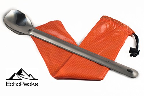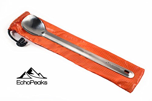 Product Description With the right length, shape, and angles, our ultralight ECHOPEAKS long-handled spoon gets to the bottom of your meal pouch or Jetboil cooking cup. Lightweight orange nylon stuff bag included. 0