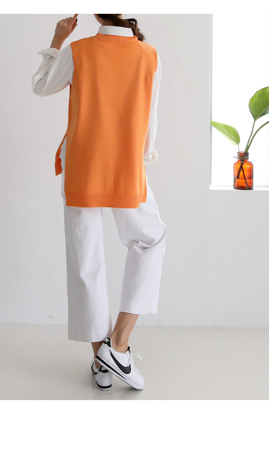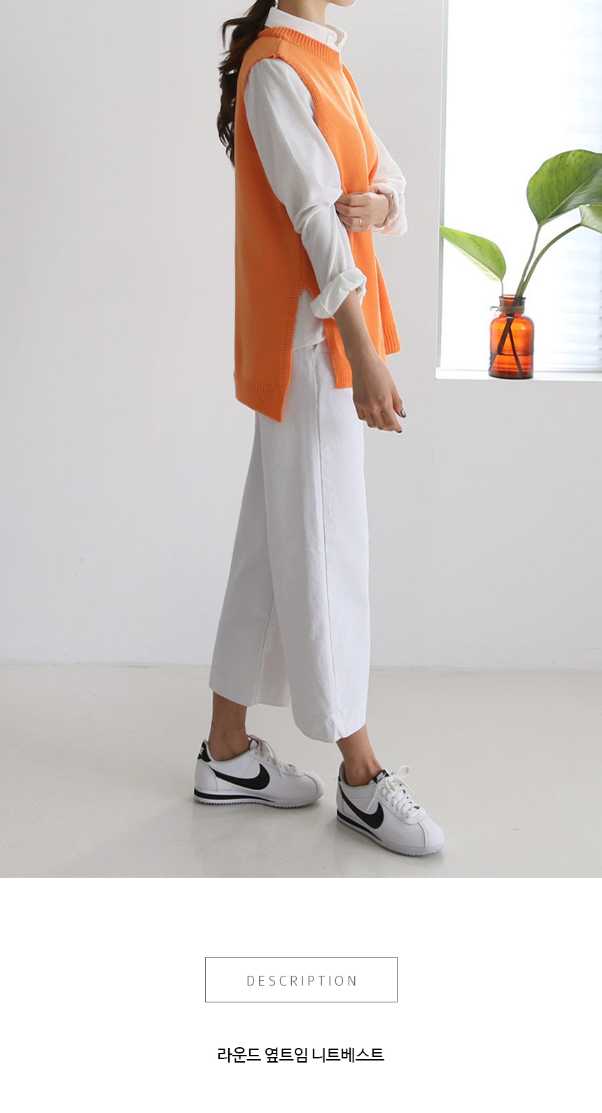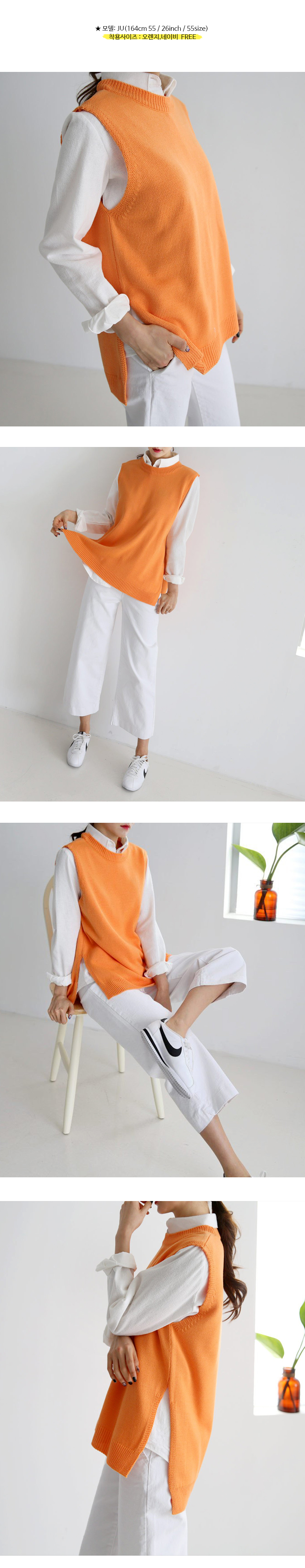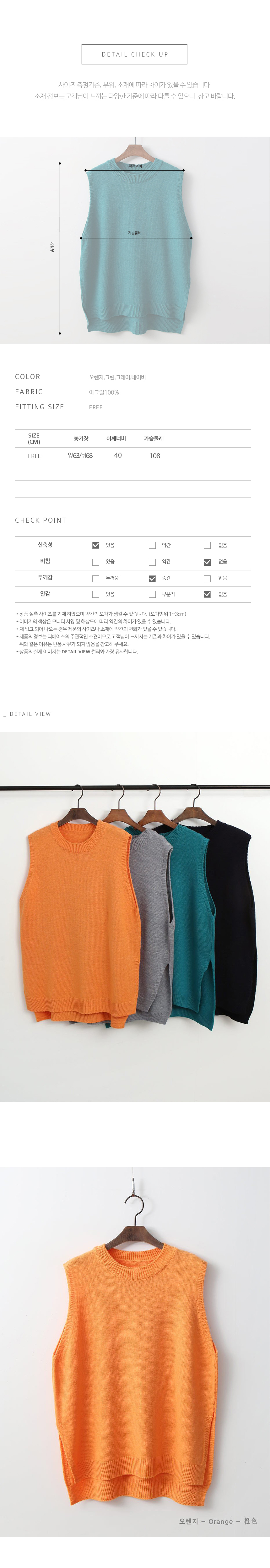 깔끔한 무드로 데일리 하게 즐기기 좋은 베스트예요. 전체적으로 심플하고 베이직한 디자인이기 때문에 어디에나 매칭이 쉬어 데일리 하게 활용하기 좋구요, 밑단 양 옆의 슬릿과 앞, 뒤 기장이 살짝 언발란스한 길이감은 밋밋함을 없애주는 동시에, 모델처럼 팬츠 위로 루즈하게 연출하거나 넣어 입기에도 좋아 다양한 연출까지 도와준답니다. 색상은 그린, 오렌지, 그레이, 네이비 사이즈는 FREE 55~77