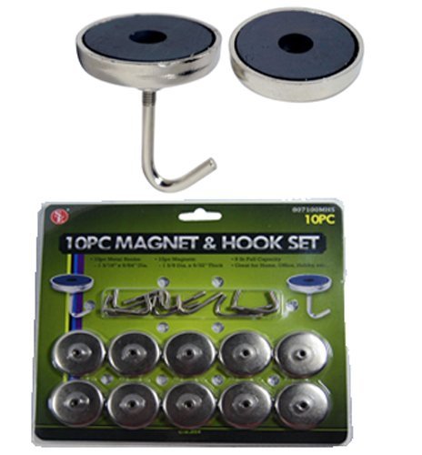 -. Brand : SE -. Color : Silver -. EAN : 0706569074949 -. Feature : Hang it all with this set of (10) magnetic hook / The 1-3/16" long x 9/64" hooks screw into 1-3/8" dia magnetic bases / 8-lb pull / Good for horizontal or vertical mounts, and dandy for adding hooks to gym or school lockers -. Label : SE -. Manufacturer : SE -. Model : 807100MHS -. MPN : 807100MHS -. NumberOfItems : 1 -. PackageQuantity : 10 -. PartNumber : 807100MHS -. ProductGroup : Kitchen -. ProductTypeName : KITCHEN -. Publisher : SE -. Studio : SE -. Title : Magnet & Hook Set 10pc -. UPC : 706569074949