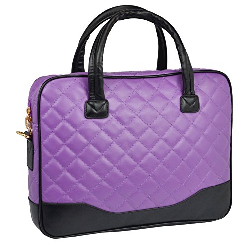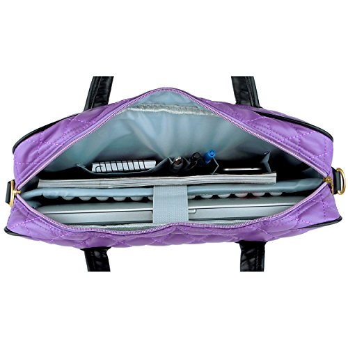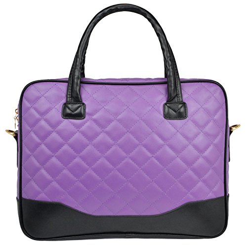 Chic and classic diamond quilted pattern in purple bordered by black accent color. This stylish and practical 14.1 inch laptop shoulder bag keeps your computer safely by your side throughout the day. Features bubble-style padded foam laptop sleeve which protects your notebook extra securely wrapped and held tightly in place with a sturdy Velcro elastic strap. Spacious dual zipper computer briefcase also has enough room for your books, blinder, documents, magazines, USB cable and power cord. Keep the smaller daily essentials in place and easy to find with 3 pen holders and 2 top open pockets organization panel. Comes with removable matching color accessory case to help you organize or transport the accessories in ease. If your busy, travel-filled day requires you to go hands free, just clip on the removable and adjustable shoulder strap onto this computer office tote and you're good to go.* Due to monitor variations colors may appear slightly different. Device not included.
