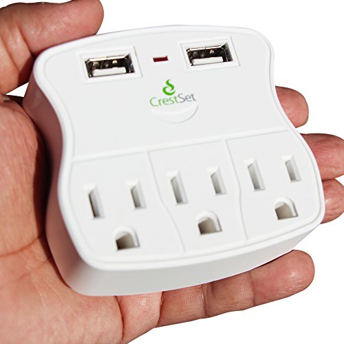 Portable USB Wall Outlet — Features 2 USB Ports 3 AC Ports - 5-Outlet Power Strip - Mini Travel Plugin - Charge iPhones, iPads, Laptops, Tablets, Bathroom Accessories and More - by CrestSet
