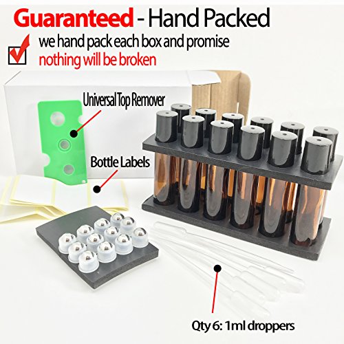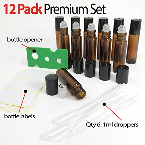 - 12 Amber Glass 10 ml UV Protection Roll On Bottles. Newest Stainless Steel Ball Roller. Qty 6 1ml Droppers and Bottle Caps. Write on Labels and Universal Top Remover Included as well.