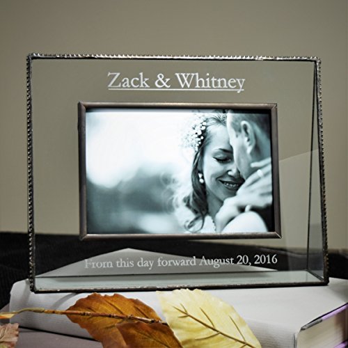 -. Feature : Holds 4x6 landscape horizontal picture; Clear glass picture frame with decorative beaded edge and etching / FREE Personalization on this picture frame at the bottom customize for an engagement or wedding / Triangular glass sides and base support the frame adding stability and style unique to J Devlin / Handcrafted stained glass photo frame made with lead free solder to protect you and the environment / Designed and Manufactured by J Devlin Glass Art 9 1/4 x 1 7/8 x 7