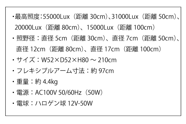 ●最高照度:55000Lux(距離30cm)、31000Lux(距離50cm)、20000Lux(距離80cm)、15000Lux(距離100cm)