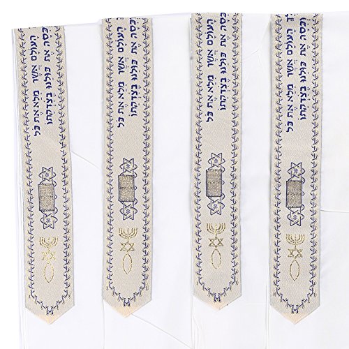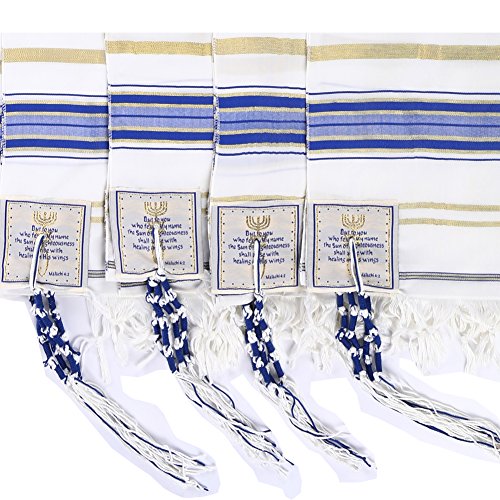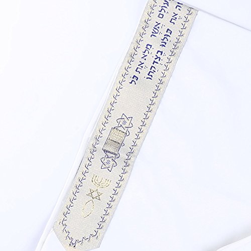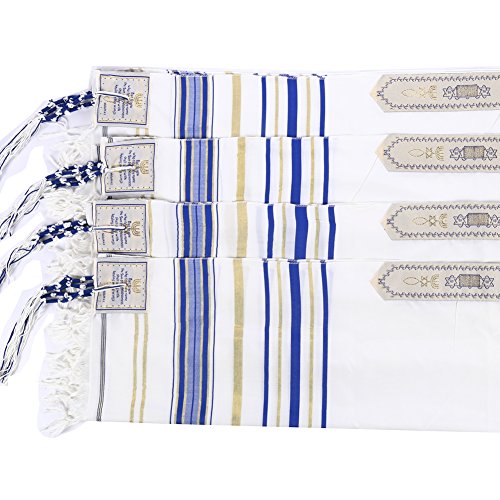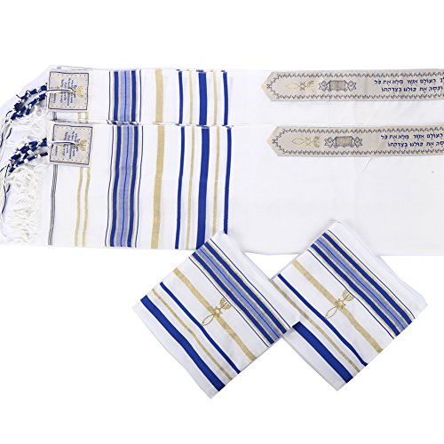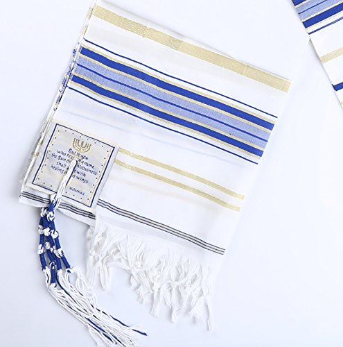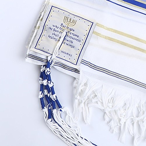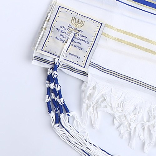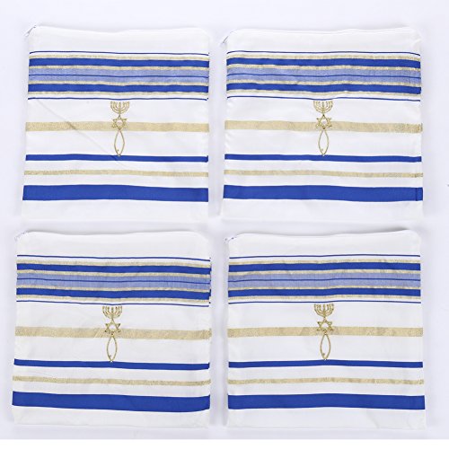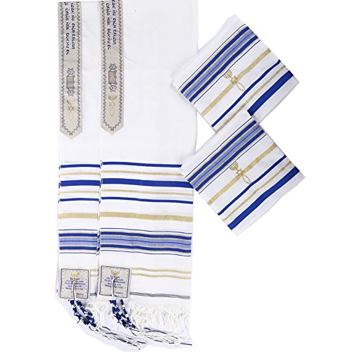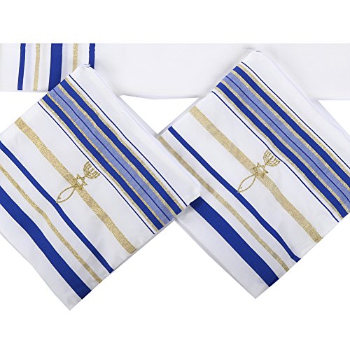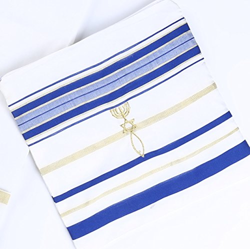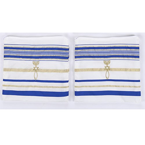 Product Description The Covenant Prayer Shawl "Tallit" is designed with the main center Christian prayer in Hebrew letters the 4 prayers embroidered on the 4 corners In English. The unique early Christian sign is embroidered with golden thread. The Material 100% Acrylic Polyester the size is 72" X 22" ( 180cm x 56cm). The Tallit comes in a matching bag with zipper from the same material of High Quality Acrylic Polyester. All 4 corners contain the white and purple thread plus the Sign contains the 7 Candle holder "Menorah" on top, The Star of David in the middle and the Fish on the bottom. The fish was used by Christians for identification during the Dark Roman Occupation in the Holy Land. The main Prayer embroidered in Hebrew on the (Atara) reads in English as follow: Blessed are you O' Lord King of the Universe Who has fulfilled all of the law through Jesus the Messiah and have covered us with his Righteousness. Pronunciation of the above Hebrew prayer in English is: BARUCH ATAH ADONAI ELOHENU MELECH HA' OLAM ASHER MILLA ET KOL HATORAH BIYASHU' HAMASHIAH IKISSA ET KULANU VETSEDKATO the main prayer embroidered with Gold thread. Most popular Tallit with Messianic design. Size about 72x22 inches. We carry this Messianic Tallit in four colors - Navy Blue, Royal Blue, Pink and Purple all with golden stripes. It is a full size MessianicTallit. 0