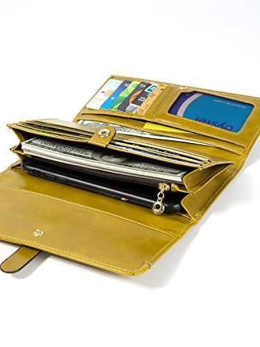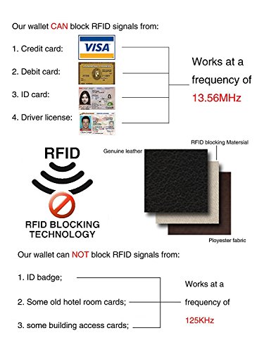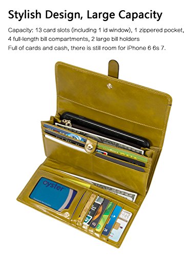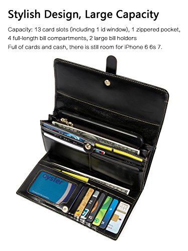 -. Feature : LARGE CAPACITY - 13 card slots(including 1 id window) for credit cards and business cards, 4 full-length bill compartments for bills, 2 large bill holders for cash, checkbook and smart phone like iPhone 6/6S/7 Plus, 1 zipper pocket for coins. Enough space for holding your cards, receipts, cash, coins, photo and so on. / 100% GENUINE LEATHER - Made of smooth, soft and high quality full-grain leather. It looks luxury and classic and Looks even better after using for a long time. / SAFETY & P.R.IVACY - Our wallets are equipped with advanced unique proP.R.Ietary blocking material, which blocks RFID signals and protects the valuable P.R.Ivate information stored on RFID chips from unauthorized scans. Tested & Approved by Independent Test Lab.Tested from 10MHz to 3000MHz, including 13.56 MHz in which the credit cards operate. / DIMENSIONS - 7.5*3.94*1.2in, net weights: 190g/0.42lb. Suitable size and light weight to hold the multifunction cluth wallet on hand or put it in bag. / 100% SATISFACTION GUARANTEED - Customer satisfaction is of utmost importance to us. We're confident you'll love our products, but if you're not 100% SATISFIED, our customer service team will work with you to make it right!