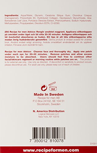 -. Binding : Health and Beauty -. Brand : Recipe for Men -. EAN : 7350012810078 -. Feature : Deep hydration / Reduces puffiness / Focused treatment -. Label : Recipe for Men -. Manufacturer : Recipe for Men -. Model : 13 -. MPN : 13 -. PackageQuantity : 1 -. PartNumber : 13 -. ProductGroup : Prestige Beauty -. ProductTypeName : LUXURY_BEAUTY -. Publisher : Recipe for Men -. ReleaseDate : 2015-02-01 -. Size : 4pairs -. Studio : Recipe for Men -. Title : Recipe for Men Under Eye Patches