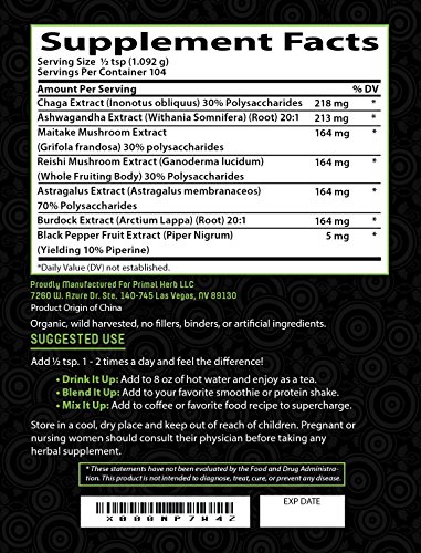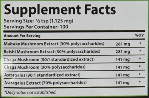 -. Feature : The Ingredients Work SYNERGICALLY to Provide Powerful Immune Support & Energy Support / REISHI MUSHROOM Extract: Helps as anImmune Modulator, Supports The Cardiovascular System & Liver. Top Longevity Tonic. / ASTRAGALUS Extract: Helps Enhance Immune Function and Facilitates an Increase in Energy Production. / CHAGA MUSHROOM Extract: Immune Support, Anti-inflammatory and Pain Relieving, Increases energy and wellbeing / MAITAKE MUSHROOM Extract : Helps Boosts the Immune System Through the Activation of Macrophage Cells, Natural Killer Cells and T-Cells.