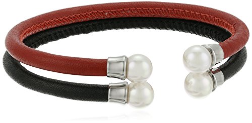 Set of 2 steel, leather and pearl cuff bangle bracelets