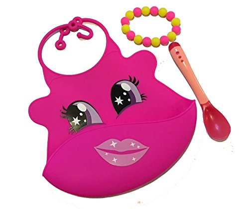 -. Title : Cute Silicone Baby Feeding Bucket Bib catches food crumb catcher Gift Set bundle Teething bracelet soft spoon pink Diva bear turtle
