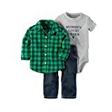 -. Feature : Cotton / Three piece outfit set includes shirt, bodysuit and jeans / Shirt: collared, long sleeves, button front design, single chest pocket, gingham pattern / Bodysuit: crew neckline, short sleeves, "mommy's lucky charm" front text, snap bottom closure / Jeans: stretch waistband, hand pockets, denim construction